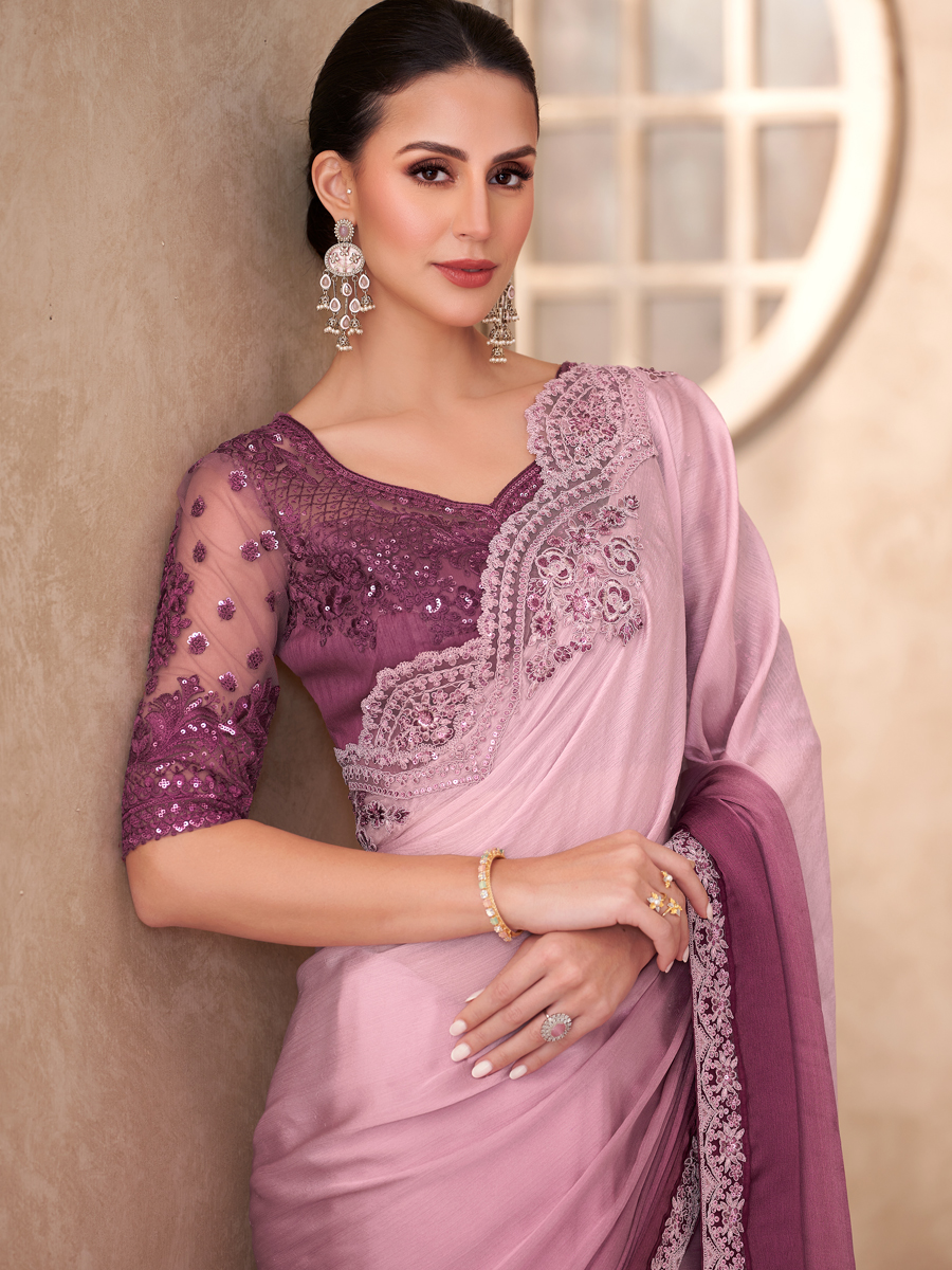Ein moderner Designersaree, der durch seine schlichte Raffinesse glänzt. Für Frauen, die dezente Eleganz bevorzugen.