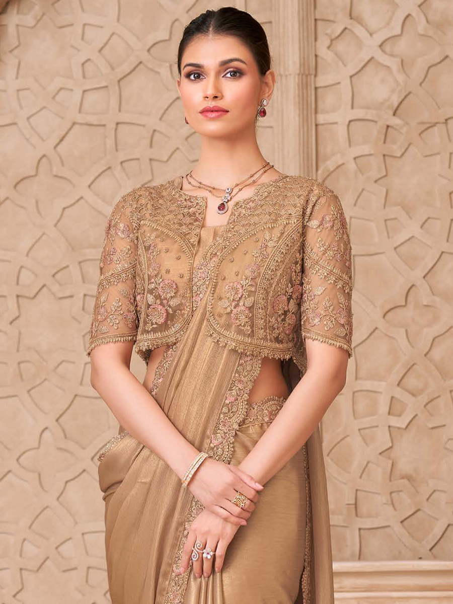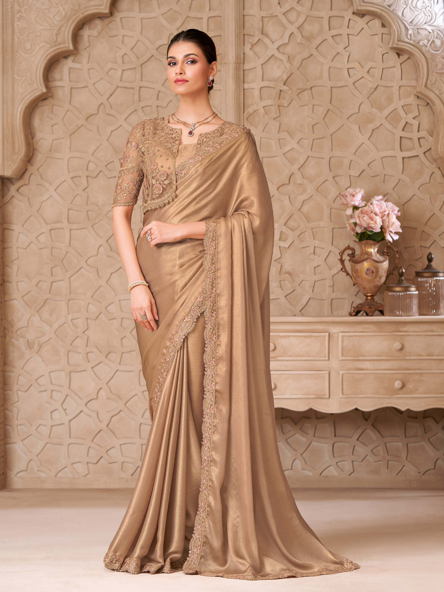 Dieser Designersaree wurde mit viel Sorgfalt gefertigt und wirkt durch seine zurückhaltende Gestaltung besonders edel. Ideal für besondere Anlässe.