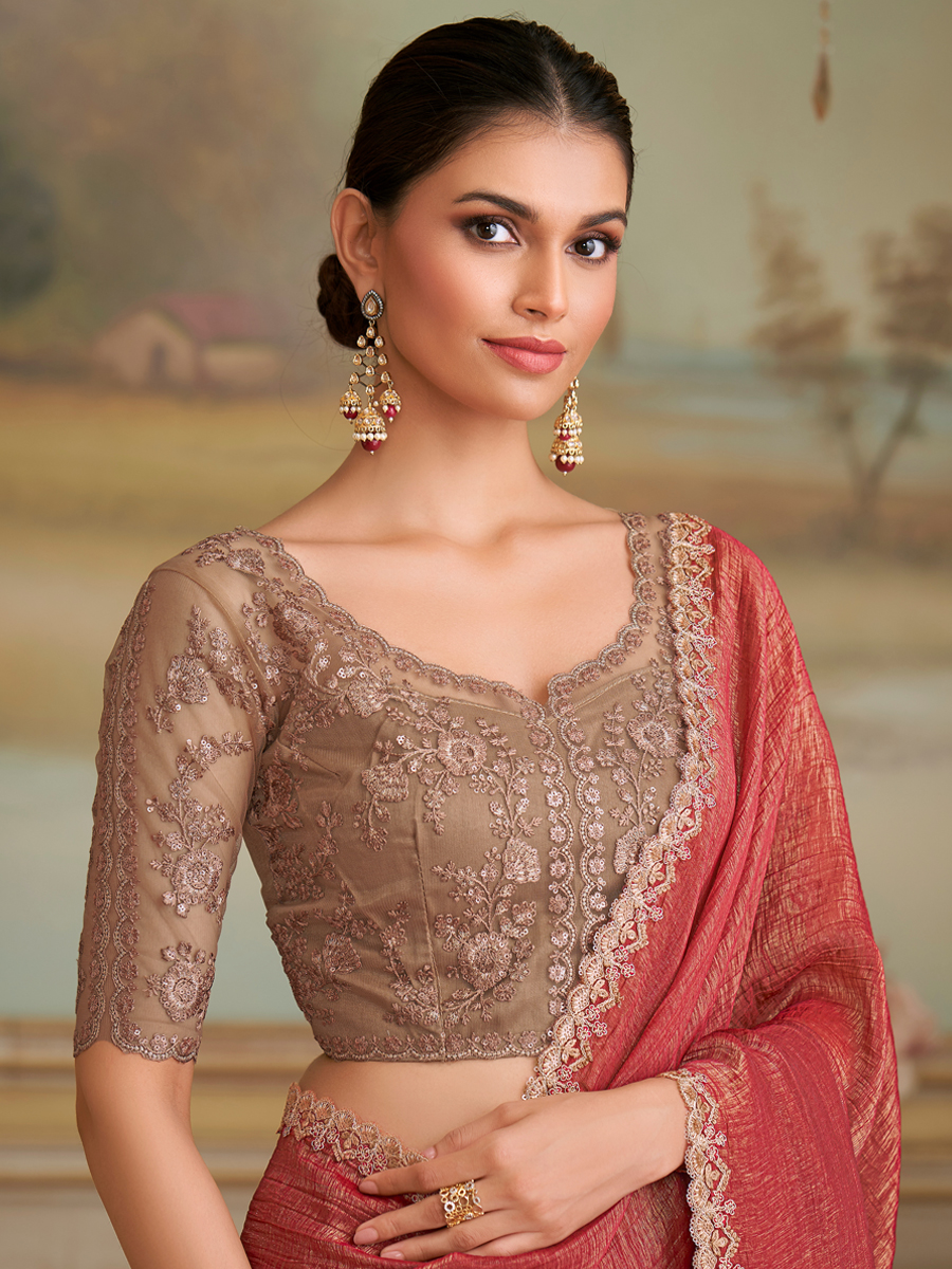 Perfekt für besondere Anlässe, überzeugt dieser Designersaree durch Komfort, Stil und seine liebevoll gestalteten Muster.