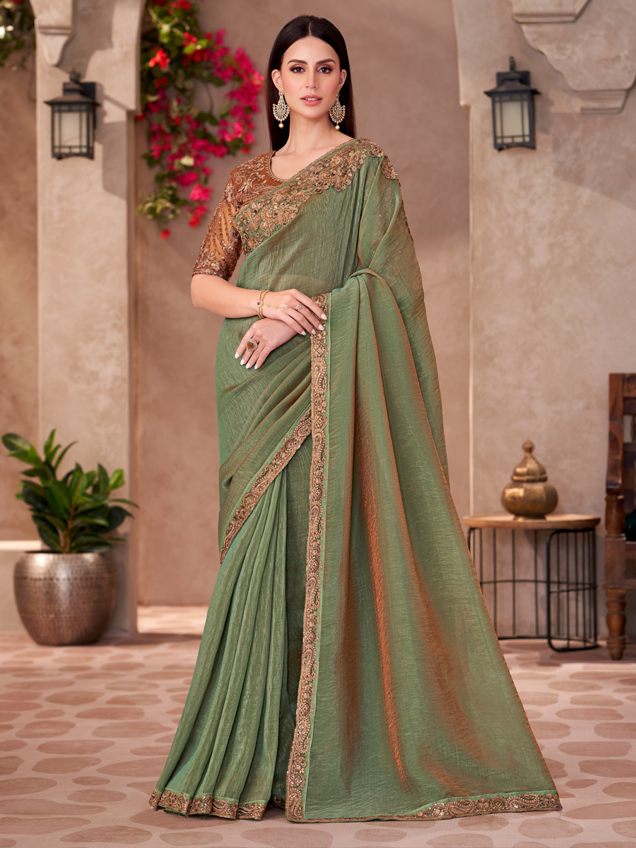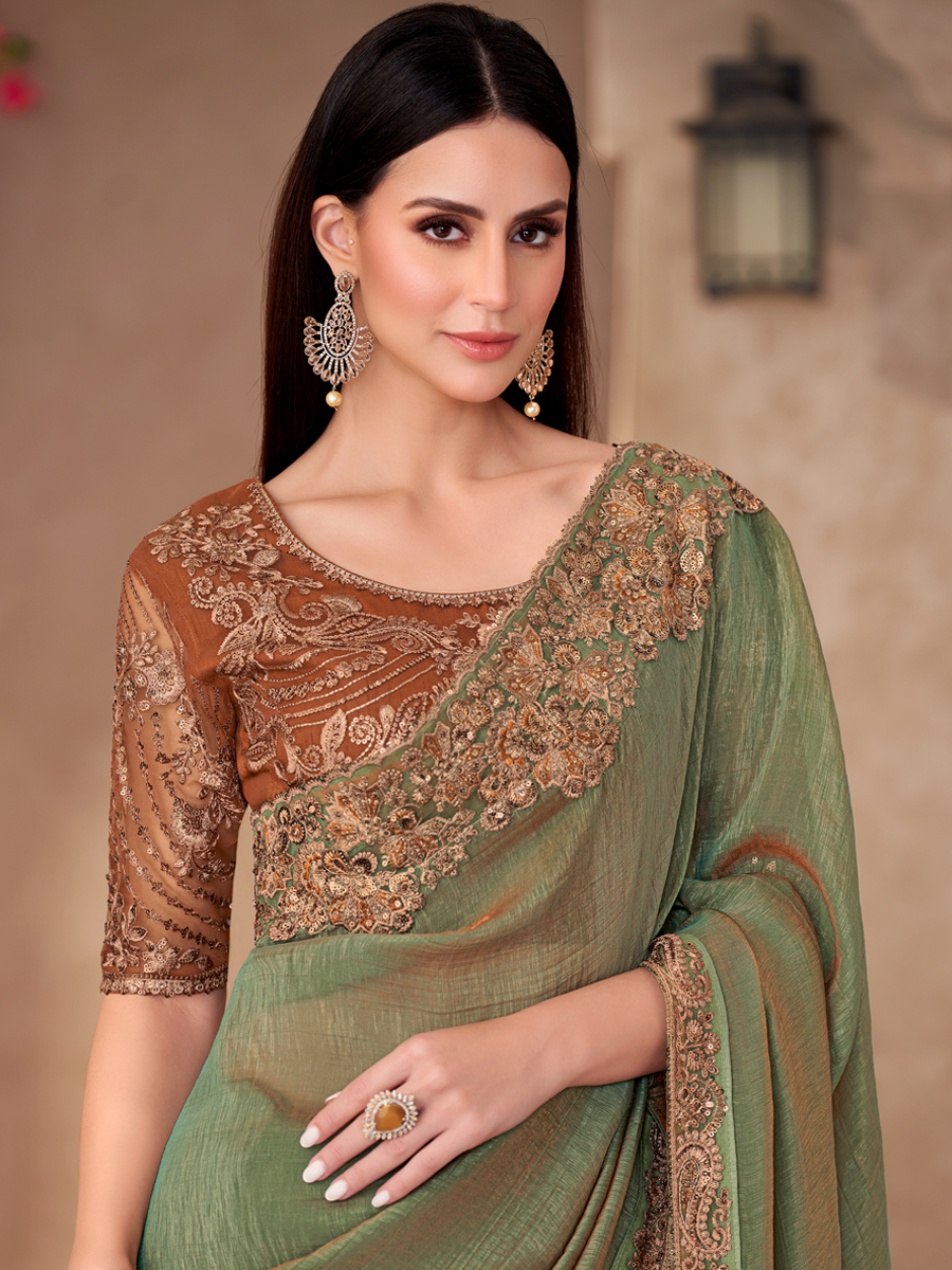 Dieser Designersaree überzeugt durch seine elegante Verarbeitung und hochwertige Materialwahl. Er bietet ein stilvolles Auftreten für besondere Anlässe.